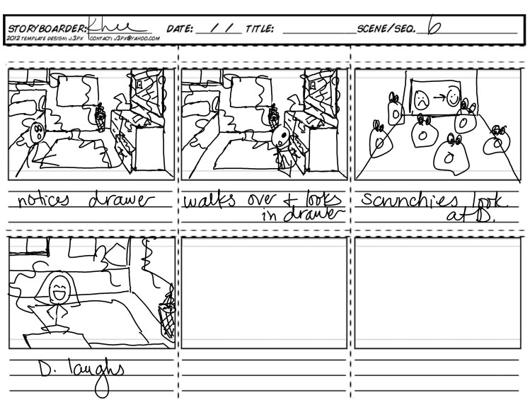 April 1, 2020 – The final Scrunchie character sheet is below. This is the link to the final animatic: